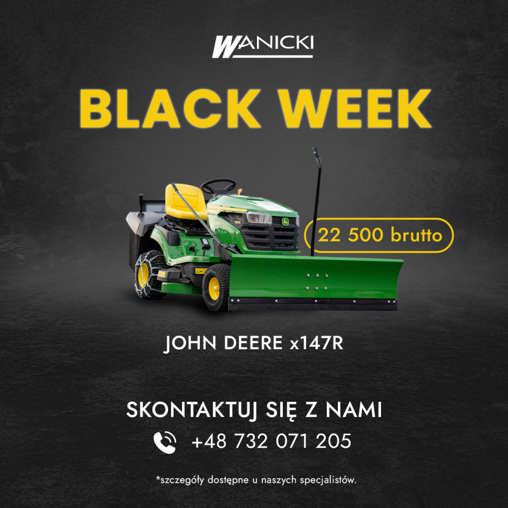 - ✅ John Deere X147R (z pługiem i łańcuchami) – 22 500 zł brutto