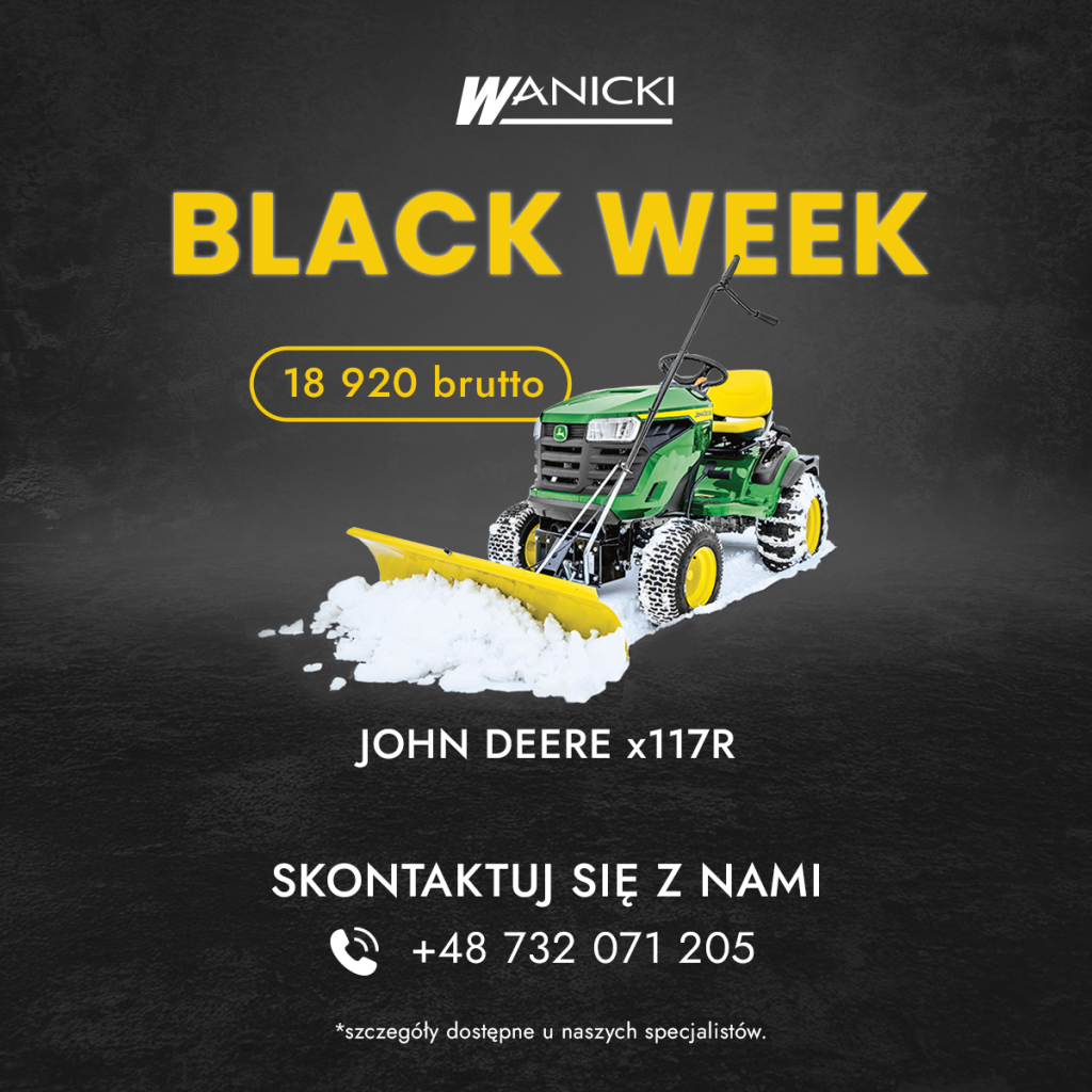 - ✅ John Deere X117R (z pługiem i łańcuchami) – 18 920 zł brutto