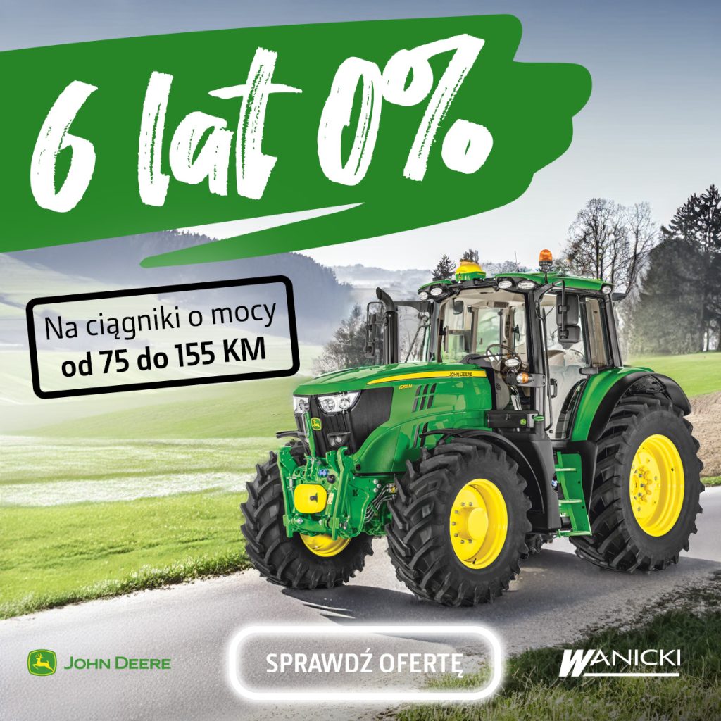 Skorzystaj z atrakcyjnego programu FINANSOWANIA 6 lat 0% na ciągniki John Deere w przedziale mocy od 75 do 155 KM dostępnego teraz od ręki w Wanicki!