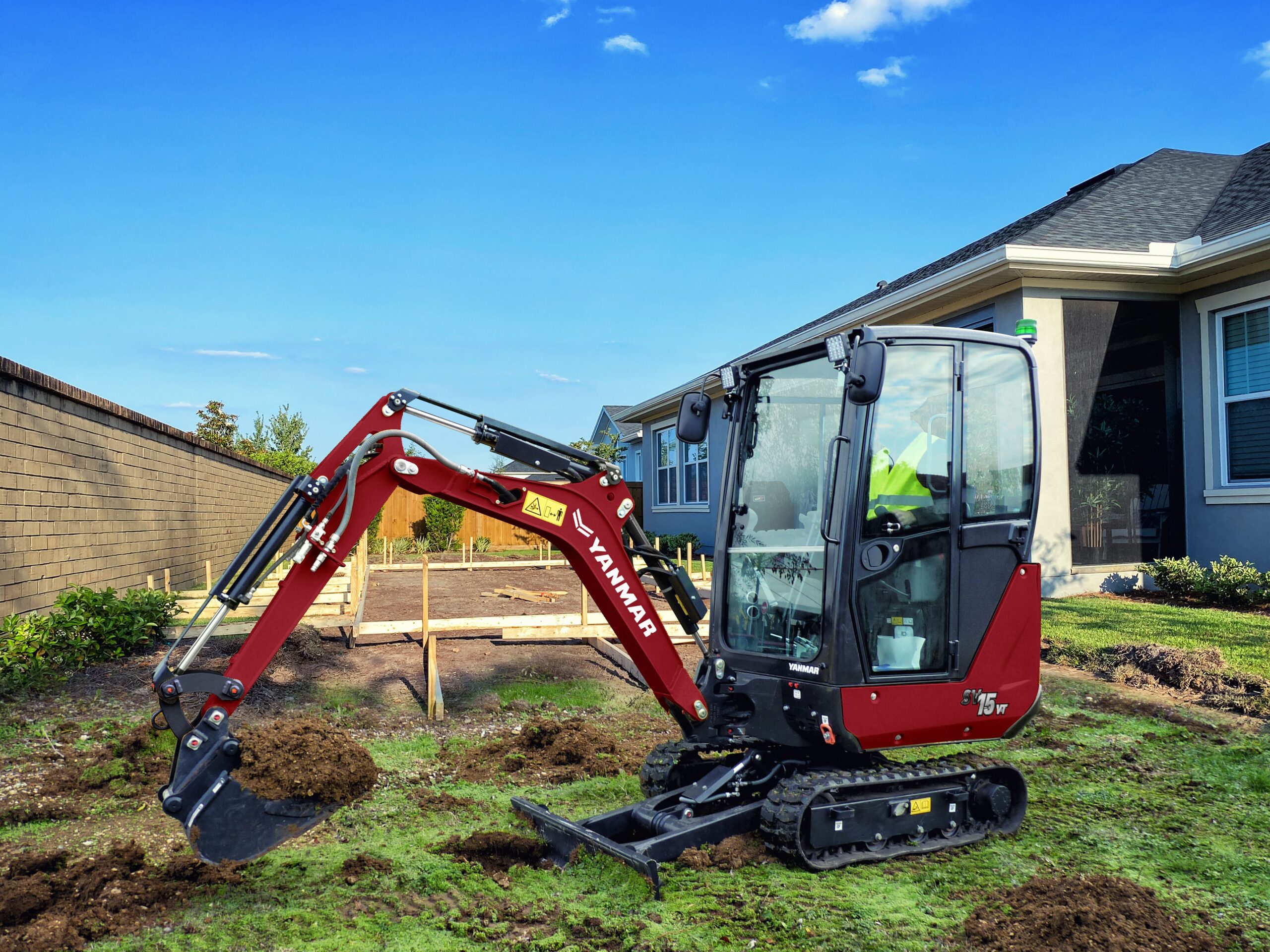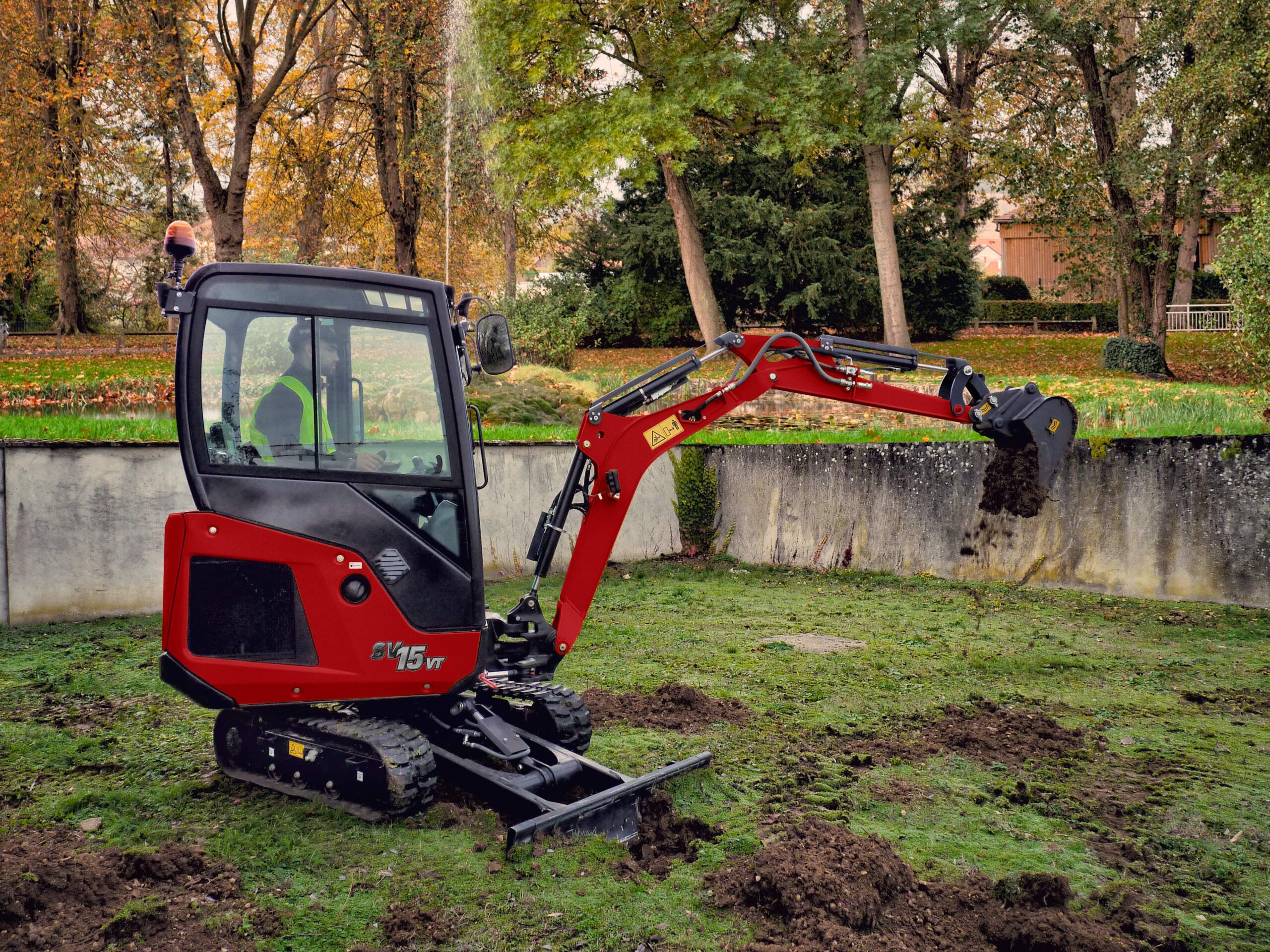 Wydajna i lekka maszyna SV15VT to idealne rozwiązanie do robót ziemnych w miejscach pracy, w których przestrzeń jest na wagę złota. Krótki promień skrętu z przodu i z tyłu w połączeniu z dużą amplitudą wychylenia wysięgnika w lewo sprawiają, że maszyna jest idealna do wykonywania wykopów i prac związanych z kształtowaniem krajobrazu w ciasnych obszarach miejskich lub na terenach mieszkalnych. Kompaktowe wymiary i ciężar wynoszący zaledwie 1465 kg/1555 kg (canopy/kabina) oznaczają, że SV15vt można łatwo transportować między miejscami pracy wraz z łyżkami i lekkim osprzętem roboczym, na standardowej przyczepie o dopuszczalnej masie całkowitej 2,5 tony. Niezawodny i mocny model SV15VT jest wyposażony w układ hydrauliczny z podwójną pompą zębatą, dostarczający 28 l/min przy max. ciśnieniu 205 barów. Maszyna jest wyposażona w standardowy pomocniczy przewód hydrauliczny do młotów lub wiertnic, zapewniający przepływ 29 l/min przy maksymalnym ciśnieniu 120 barów.